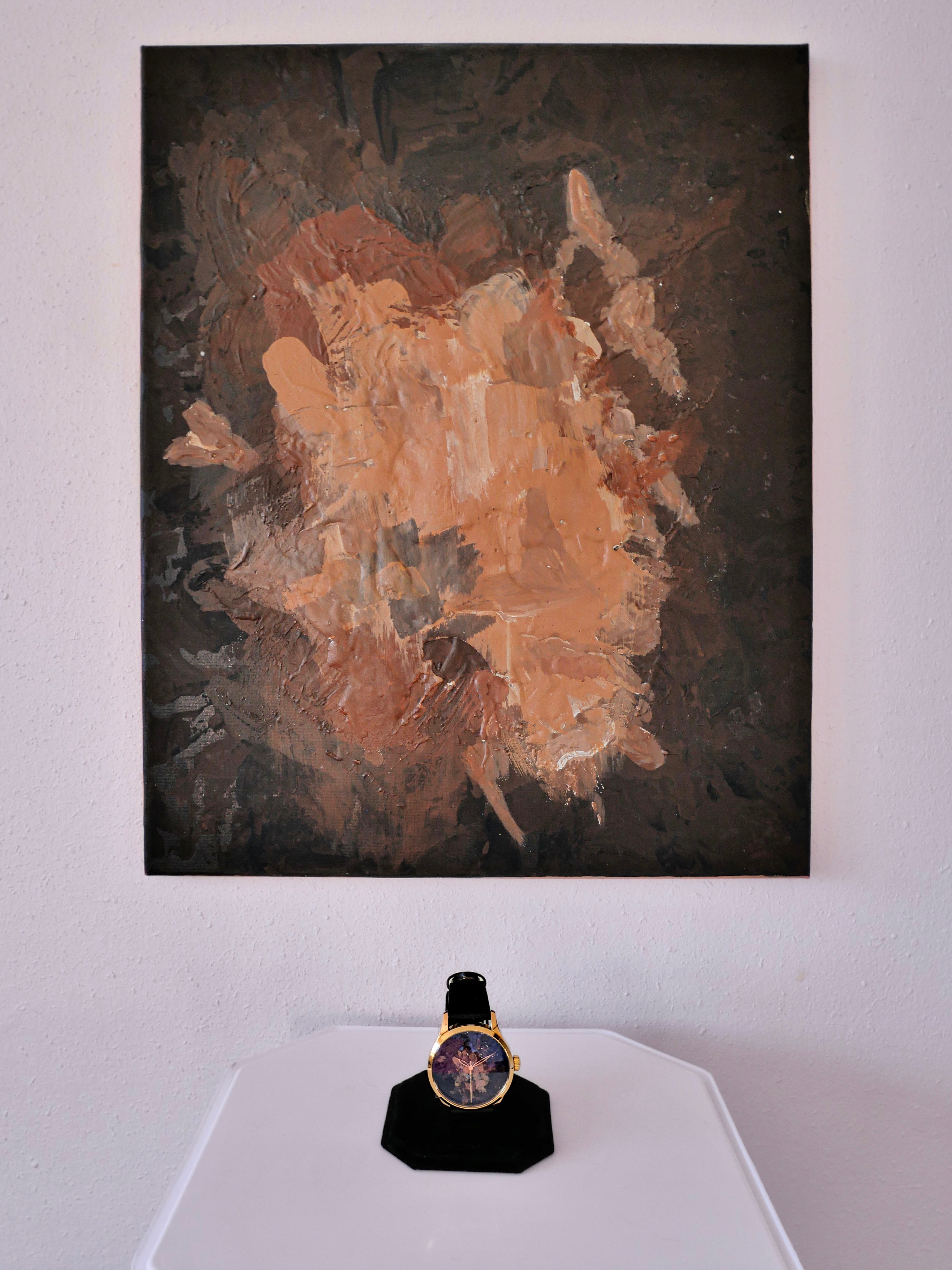 The Siena watch features an abstract hand-painted dial in earthy tones, painted on both sides and visible through the skeletonized Swiss movement and exhibition caseback. The matching 16x20” mixed media canvas echoes the same tonal depth and warmth.