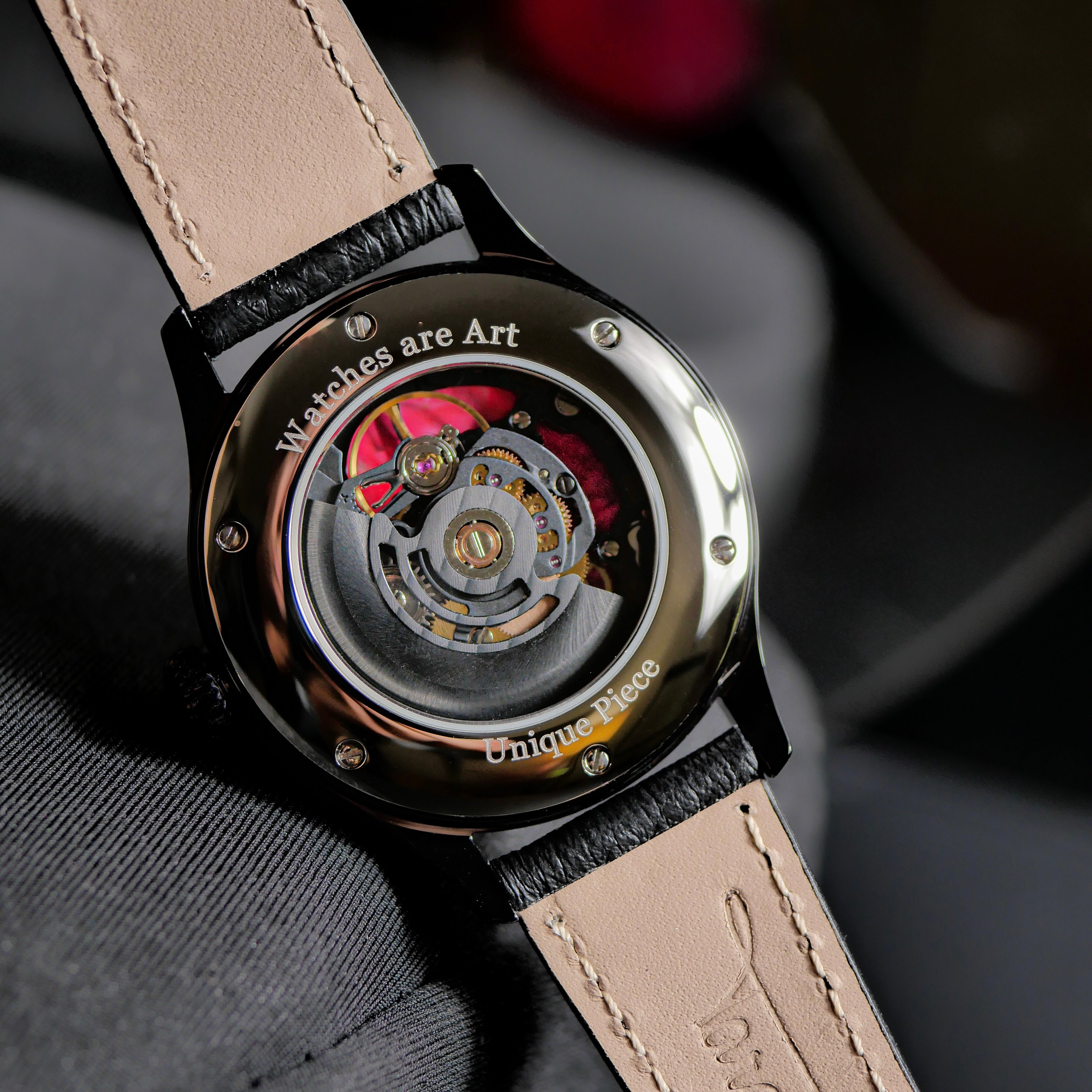 Experience the epitome of luxury and craftsmanship with Rosalia. Powered by a Swiss mechanical & automatic movement, this timepiece is the perfect blend of precision and elegance. Each watch features a hand-painted dial, meticulously craftet by myself, a Swiss watchmaker and the founder of Tarchini, ensuring that every piece is a unique work of Art. The dial is painted on both sides, allowing you to admire the artwork from the back of the watch through the openings of the skeletonized movement.